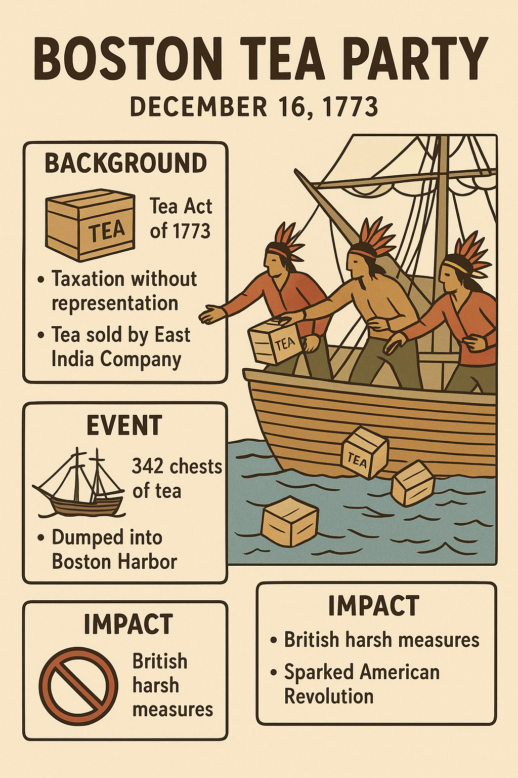 ボストン港に停泊していた東インド会社の船に対し、植民地の急進派が船に積まれていた45tの茶葉を海に投げ捨てた。