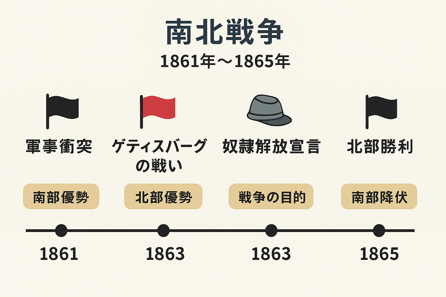 北部:アメリカ合衆国を維持しようとした側。産業・商業中心。奴隷制には否定的。
